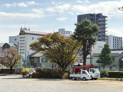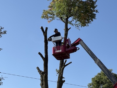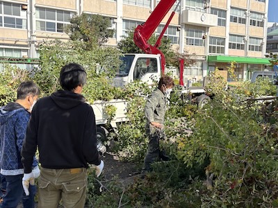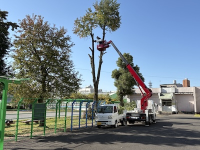 高所作業車を使って、高い木々の枝を次々に切り落としてもらえて、とてもすっきりしました。