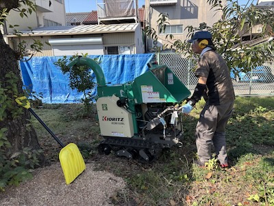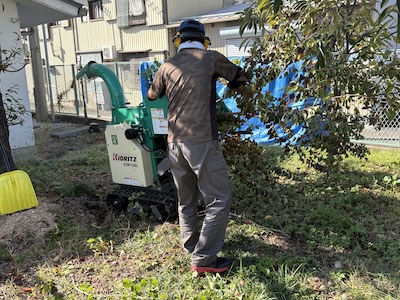 昨年、コミュニティ事業助成金の申請でいただいた粉砕機を使って、伐採すると同時に木片を粉砕しました